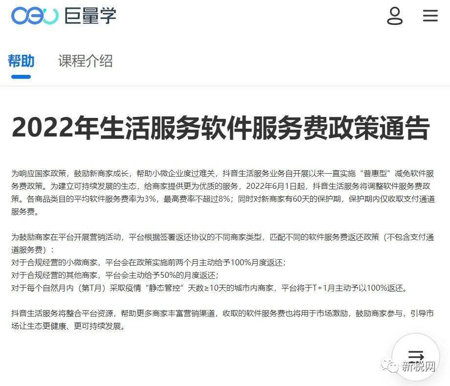 抖音《2022年生活服務軟件服務費政策通告》通告顯示,自2022年6月1日起,抖音生活服務將調整軟件服務費政策。各商品類目的平均軟件服務費率為 3%,最高費率不超過 8%;同時對新商家有 60 天的保護期,保護期內僅收取支付通道服務費。