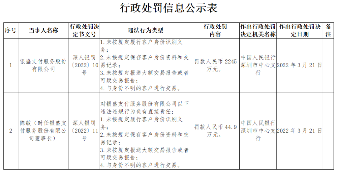 此外,行政處罰決定書(深人銀罰〔2022〕11號(hào))顯示,時(shí)任銀盛支付服務(wù)股份有限公司董事長(zhǎng)陳敏對(duì)上述違法違規(guī)行為負(fù)有直接責(zé)任,中國(guó)人民銀行深圳市中心支行2022年3月21日對(duì)其罰款人民幣44.9萬(wàn)元。