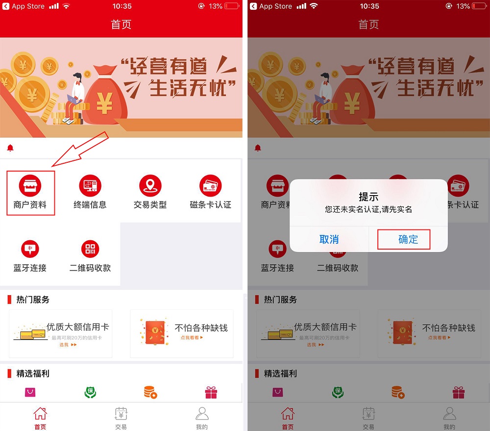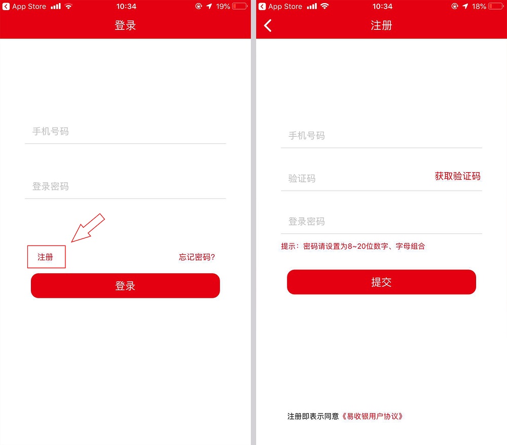 打開易收銀APP點擊注冊 進入注冊界面 進行注冊