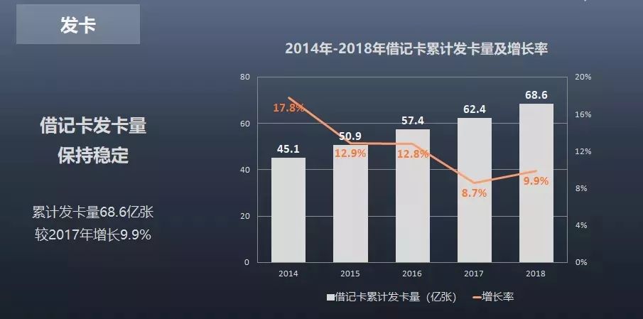 其中,信用卡累計發卡量為9.7億張,較2017 年底增長22.8%,信用卡人均持卡量為0.7張;借記卡累計發卡量為68.6億張,較2017年底增長9.9%,借記卡人均持卡量為4.92張。
