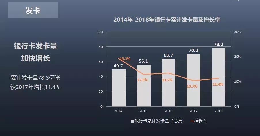 從發卡情況來看,截至2018年底,我國銀行卡累計發卡量為78.3億張。